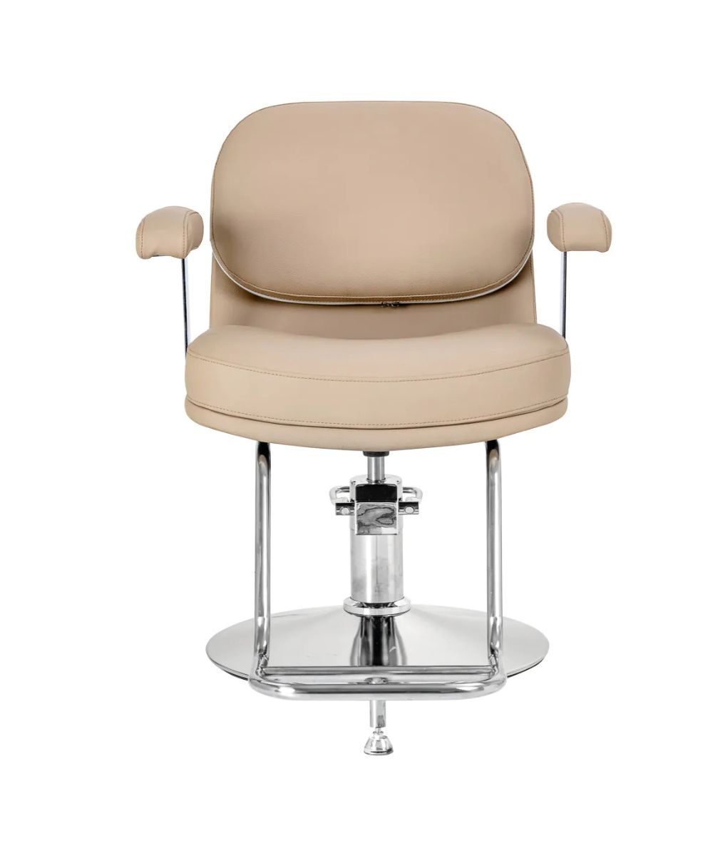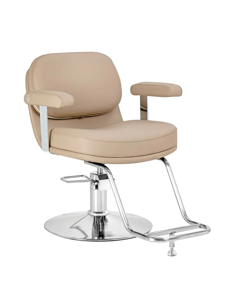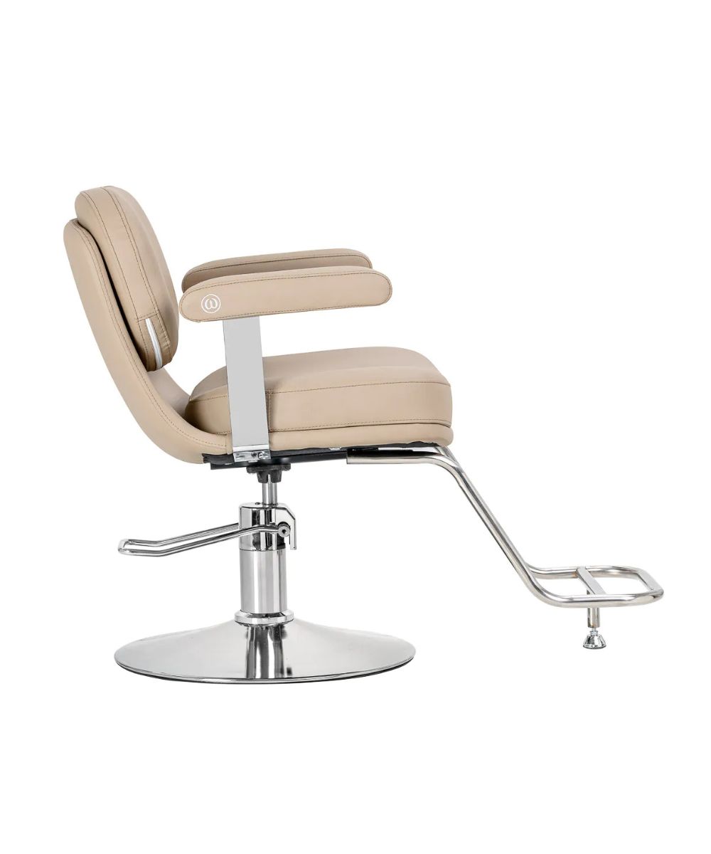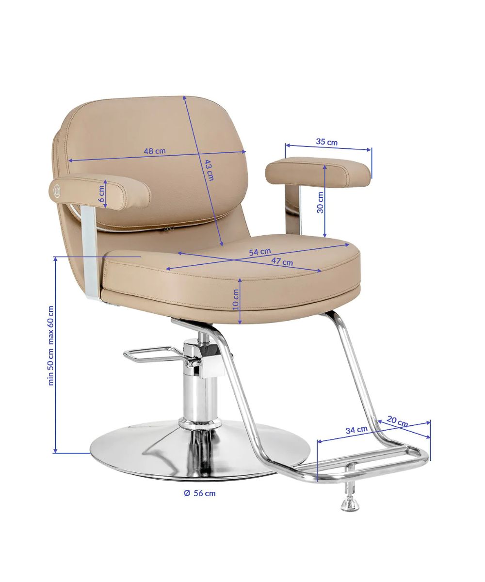 Mallille on ominaista moderni ja hillitty tyyli, joka korostaa täydellisesti salongin ammattimaista ilmettä. Korkealaatuisesta beigenvärisestä keinonahasta valmistettu verhoilu antaa tuolille kevyen ja tyylikkään ilmeen.