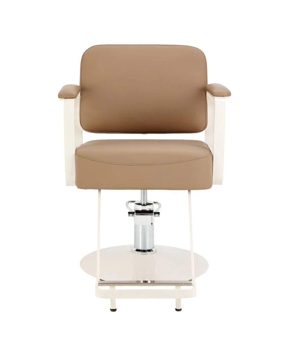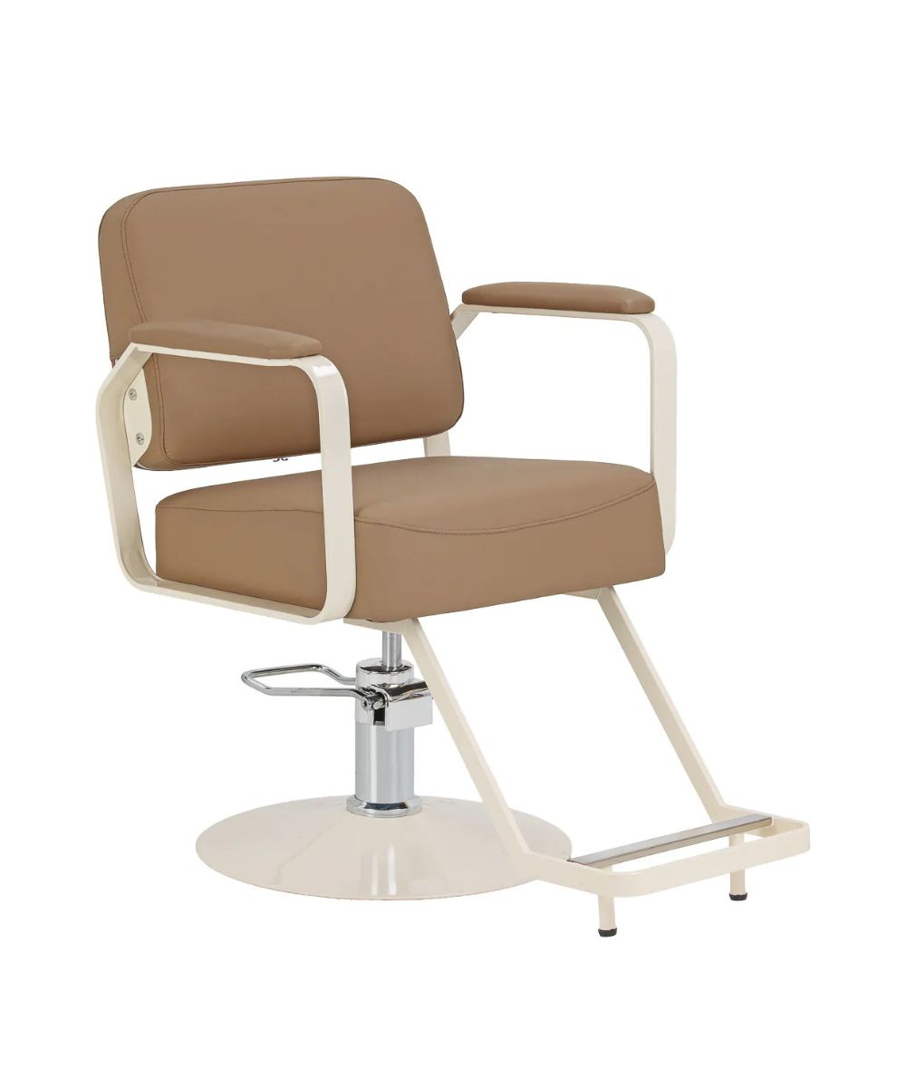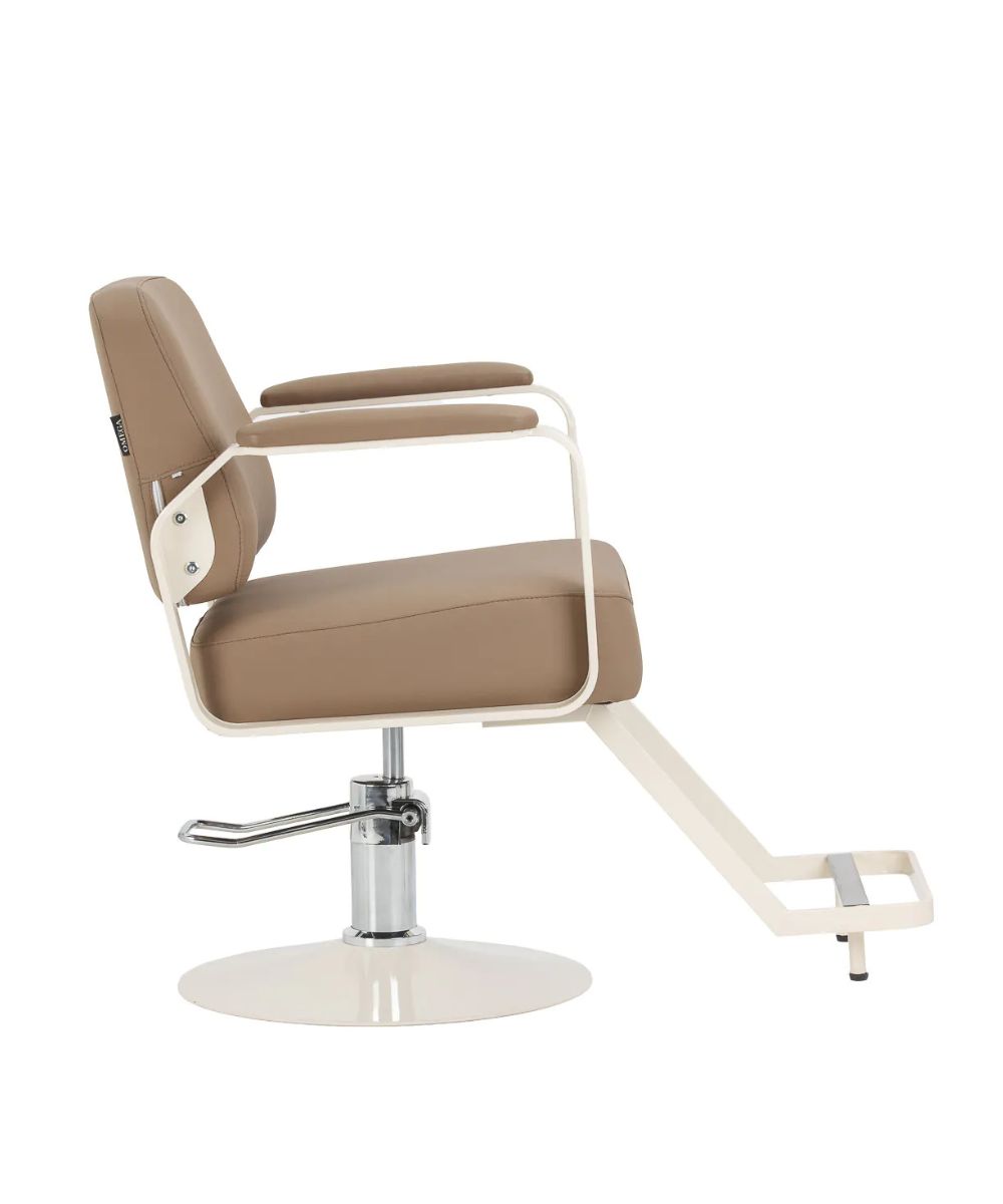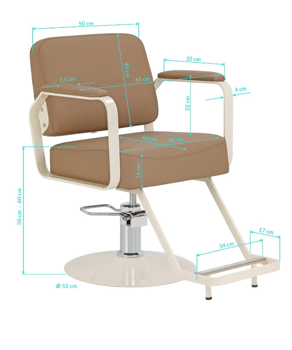 Tuoli on suunniteltu mukavuutta ajatellen pitkien työpäivien aikana kampaamossa. Paksu ja pehmeä istuin sekä ergonomiset, osittain pehmustetut metalliset käsinojat tukevat asiakkaan luonnollista ryhtiä ja mahdollistavat tarkat ja mukavat kampaamopalvelut.