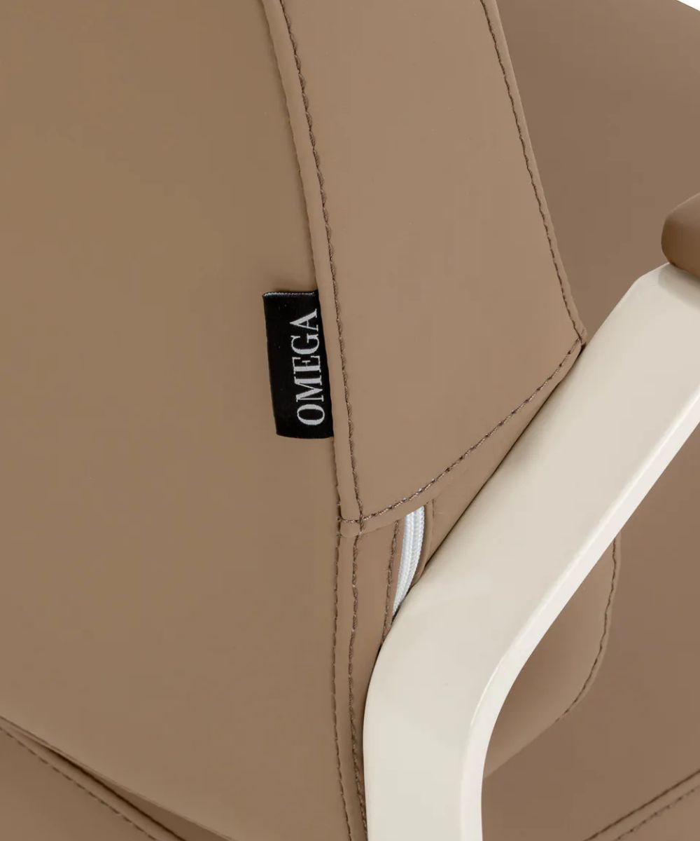 Tuolin moderni muotoilu ja tukeva pyöreä beigenvärinen jalusta korostavat sen eleganttia luonnetta. Pehmeä vaaleanruskea keinonahka takaa erinomaisen mukavuuden myös pidempien toimenpiteiden aikana ja on samalla kestävä, kosteutta hylkivä ja helppo puhdistaa.