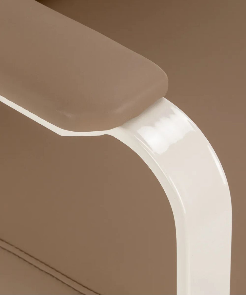 Tyylikäs synteettinen nahkaverhoilu vaaleanruskeissa sävyissä on kestävä, kosteutta hylkivä ja helppo puhdistaa. Beigen sävyinen pyöreä jalusta ja moderni muotoilu sopivat hyvin sekä nykyaikaisiin että klassisiin salonkiympäristöihin.